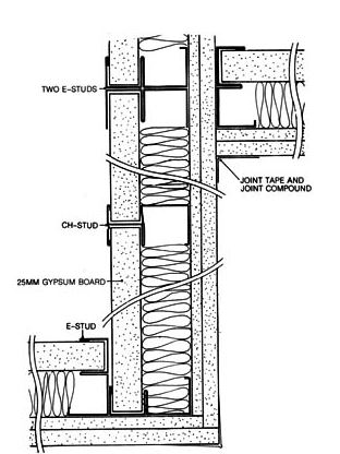 CH 스터드와 E형스터드는 PS 혹은 ES 등으로 불리는 대형건축물의 MEPF(Mechanic, Elec, Pipe, Fire)등의 각종 배관이 코어에서 분배되는 구조를 만들기 위한 파이프 샤프트부위 방화벽에 선택적으로 사용되는 형태로 주로 CH 스터드가 사용되며 구조적으로 마무리되는 부위에 필요한 경우 E형 스터드를 덧붙여 사용되는 형태입니다. 고층 건물에서의 샤프트는 계단실, 엘리베이터 샤프트, 서비스 덕트, 환기구, 배연구와 같은 수직공간으로 연결되어 화재 확대가 매우 잘 되는 공간으로 따라서 건축물의 샤프트는 방화구획으로 하여야 되며 내화 2시간 까지 견디어야 합니다. 또 샤프트는 바닥 슬라브가 없는 빈 공간이므로 실내면에서만 시공하여야 하기 때문에 특수한 러너와 스터드를 사용하여야 한다.