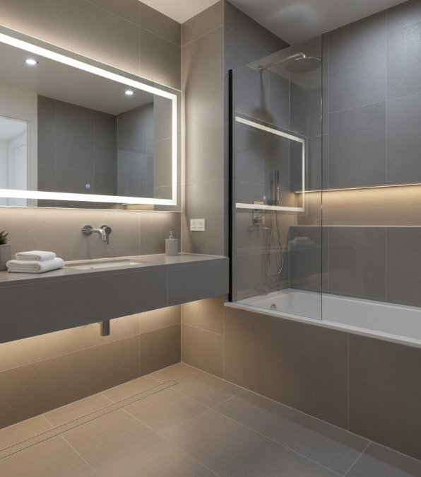 극강의 심미성: 타일이 끊기지 않고 이어지는 듯한 일체감을 주어 공간이 더 넓고 정돈되어 보입니다.