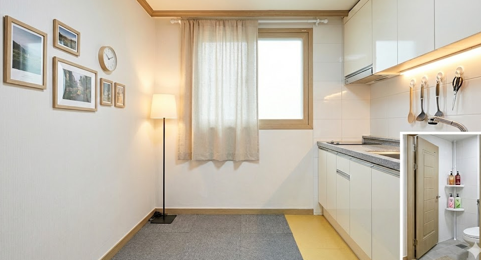 오래된 구축 아파트나 빌라의 경우 주방 타일에 기름때가 있거나 욕실 수납공간이 부족한 경우가 많습니다. 타일에는 절대 구멍을 뚫으면 안 되기 때문에 다음 두 가지 방법을 추천합니다.